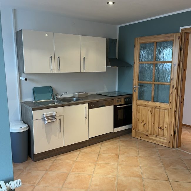 FeWo mit 40m² für max. 3 Gäste, Wohn- / Esszimmer mit Küchenzeile, 1 Schlafzimmer und Bad. Die Wohnung im Erdgeschoss ist ideal für Paare oder Einzelpersonen. Die zu der Wohnung gehörenden Terrasse ist mit Gartenstühlen, Tisch und einem Grill ausgestattet. Eine Treppe führt in den Garten, der mit benutzt werden kann. Dort stehen Liegen und Gartenspiele zu Verfügung.
