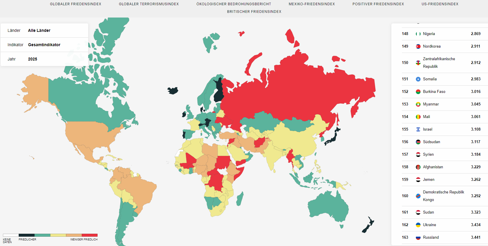 Der Global Peace Index (GPI), ist das weltweit führende Maß für globale Friedlichkeit, herausgegeben vom Institut für Wirtschaft und Frieden (IEP)